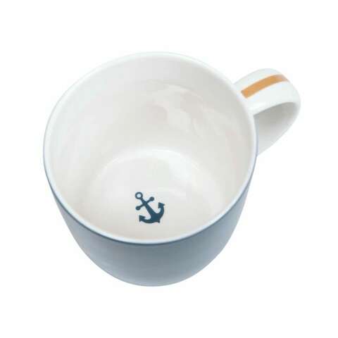 Die Details sind kupferfarben mit Metallic-Effekt auf edlem dunkelblau. Als besonderen Clou findet sich ein kleiner Anker auf dem Tassen-Innenboden.