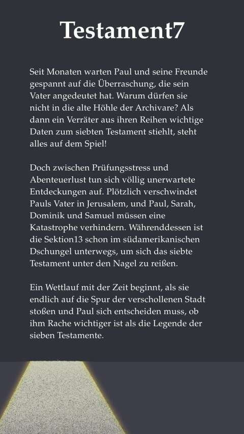 Seit Monaten warten Paul und seine Freunde gespannt auf die Überraschung, die Markus angedeutet hat. Warum dürfen sie nicht in die alte Höhle der Archivare? Als dann ein Verräter aus ihren Reihen wichtige Daten zum siebten Testament stiehlt, steht alles auf dem Spiel! Doch zwischen Prüfungsstress und Abenteuerlust tun sich völlig unerwartete Entdeckungen auf. Plötzlich verschwindet Pauls Vater in Jerusalem, und Paul, Sarah, Dominik und Samuel müssen eine Katastrophe verhindern. Währenddessen ist die Sektion13 schon im südamerikanischen Dschungel unterwegs, um sich das siebte Testament unter den Nagel zu reißen. Ein Wettlauf mit der Zeit beginnt, als sie endlich auf die Spur der verschollenen Stadt stoßen und Paul sich entscheiden muss, ob ihm Rache wichtiger ist als die Legende der sieben Testamente.