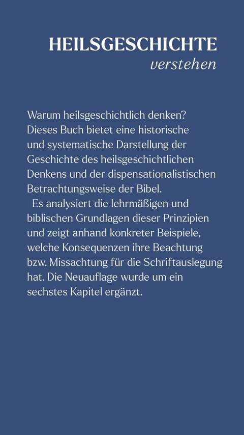 Dieses Buch zeigt, warum heilsgeschichtliches Denken für jeden Christen sinnvoll ist. Denn ohne ein entsprechendes Bibelverständnis bleibt die Auslegung – und vor allem die Anwendung – der Heiligen Schrift oft lückenhaft oder missverständlich. Statt konsequent zu fragen, was Gott für wen und für welche Zeit gesagt hat, wird die Bibellese dann auf das reduziert, was den heutigen Leser persönlich anspricht. Dadurch lassen sich große Teile der Bibel gar nicht mehr einordnen und werden kaum noch beachtet. Wer dagegen mit der Heilsgeschichte vertraut ist, wird die gesamte Bibel mit Gewinn lesen.