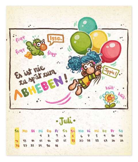 Dieser witzig-bunte Aufstellkalender begleitet humorvoll und einfühlsam durch das Jahr 2026. Er macht Mut und bietet für jeden Monat eine freche illustrierte Botschaft.