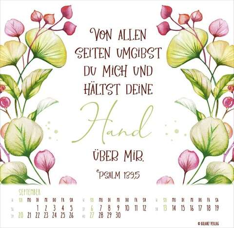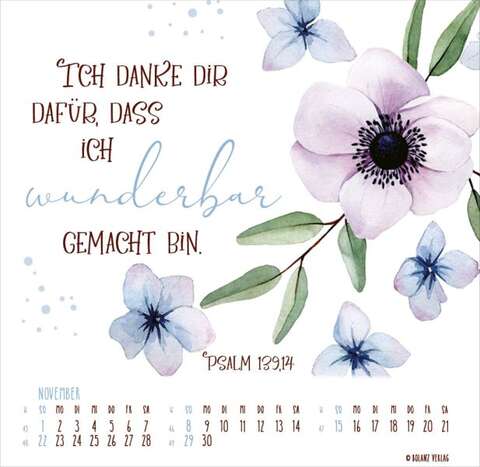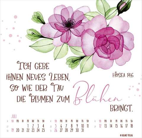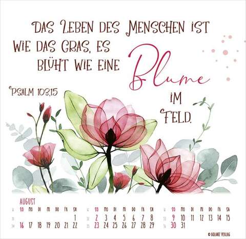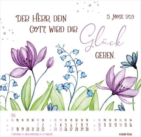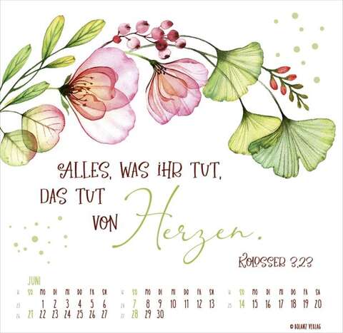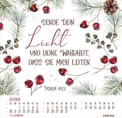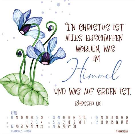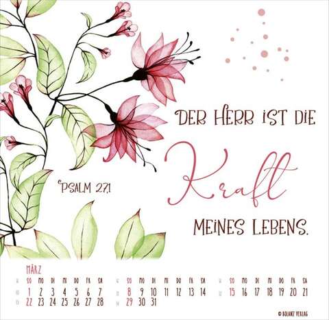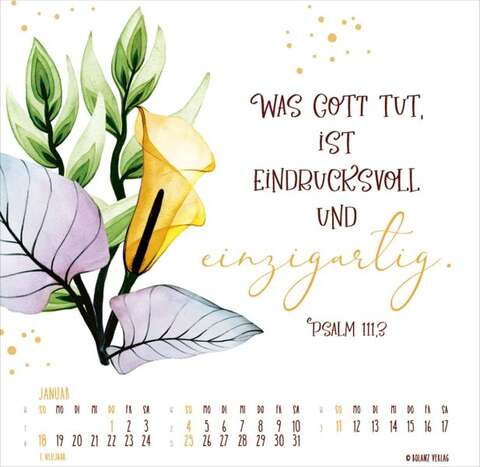Mit ausgewählten Bibelversen ausgestattet, bietet er dir inspirierende Gedanken, die deinen Tag erhellen und dein Herz stärken. Die Kalenderblätter können zudem ganz einfach ausgeschnitten und als Postkarten verwendet werden, sodass du deine lieben Worte direkt mit einem persönlichen Gruß versenden kannst.