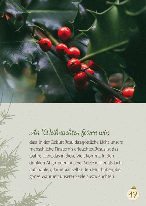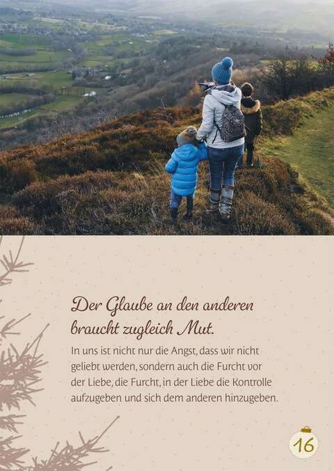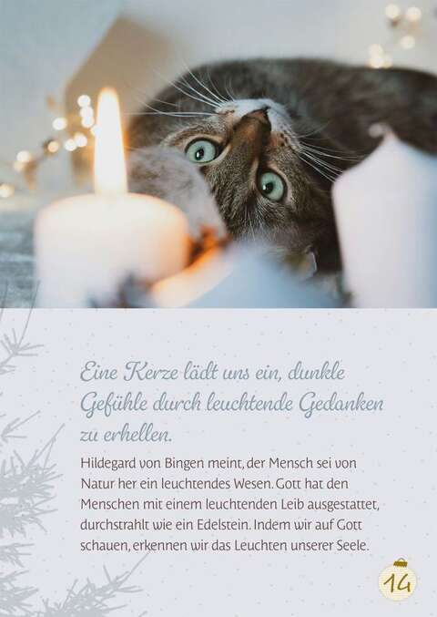 Der Advent fällt in die dunkelste Zeit des Jahres. Wir sehnen uns in diesen Wochen besonders nach Wärme und nach Licht, nach etwas, das unsere Nächte und die Dunkelheit in uns erhellt. Dieser Kalender ist ein kleiner Begleiter durch den Advent, der das Leuchten von Weihnachten mit jedem Tag heller aufscheinen und erstrahlen lässt und täglich neue Hoffnung schenkt.