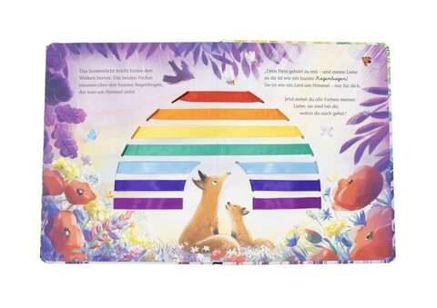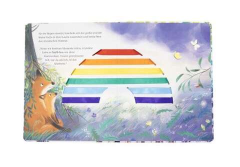 Die Seiten sind durchzogen von 7 bunten Bändern, die mit jeder umgeblätterten Seite eine zusätzliche Farbe des Regenbogens zum Strahlen bringen. Die letzte Seite enthüllt dann das Gesamtbild des Regenbogens. Ein interaktives Buch zum Staunen, Entdecken und Anfassen.