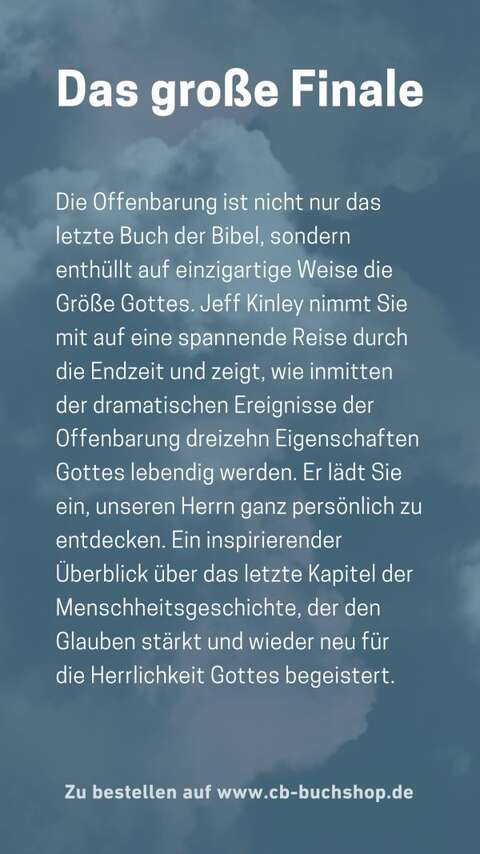Gott hat das letzte Wort. Die Offenbarung ist nicht nur das letzte Buch der Bibel, sondern enthüllt auf einzigartige Weise die Grösse Gottes. Jeff Kinley nimmt Sie mit auf eine spannende Reise durch die Endzeit und zeigt, wie inmitten der dramatischen Ereignisse der Offenbarung 13 Eigenschaften Gottes lebendig werden. Diese laden uns ein, unseren Herrn ganz persönlich zu entdecken.