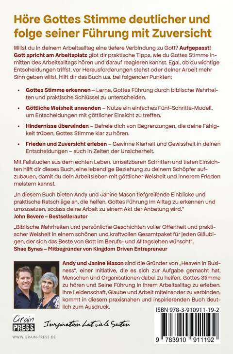"Aufgepasst! Gott spricht am Arbeitsplatz" gibt dir praktische Tipps, wie du Gottes Stimme inmitten des Arbeitsalltags hören und darauf reagieren kannst. Egal, ob du wichtige Entscheidungen triffst, vor Herausforderungen stehst oder deiner Arbeit mehr Sinn geben willst, hilft dir das Buch u.a. bei folgenden Punkten: o Gottes Stimme erkennen - Lerne, Gottes Führung durch biblische Wahrheiten und praktische Schlüssel zu unterscheiden.
