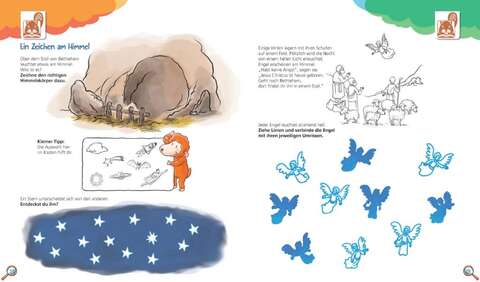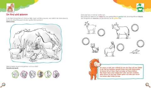 Durch Labyrinthe, Such- und Malbilder, Fehler finden, Zuordnungsaufgaben und vieles mehr entdecken sie die Geschichte von Jesu Geburt auf kreative und unterhaltsame Weise.