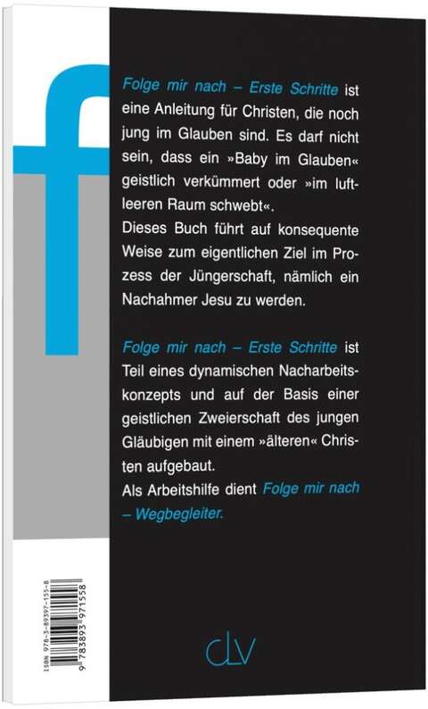 Folge mir nach – Erste Schritte ist Teil eines dynamischen Nacharbeitungskonzepts und auf der Basis einer geistlichen Zweierschaft eines jungen Gläubigen mit einem »älteren« Christen aufgebaut. Dieses Buch führt auf konsequente Weise zum eigentlichen Ziel im Prozess der Jüngerschaft, nämlich ein Nachahmer Jesu zu werden. In diesem Teil geht es um grundlegende Themen wie Heilsgewissheit, Bekenntnis, Gebet, Gemeinschaft, Gehorsam, Führung usw. Diese Themen werden einleitend kurz erklärt. Zu jeder Lektion werden Fragen gestellt, die der Leser beantworten soll.